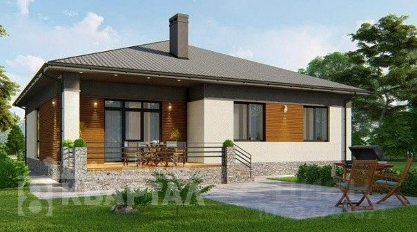 • Отмостка по периметру, панорамные окна. вставки из дерева и кирпича