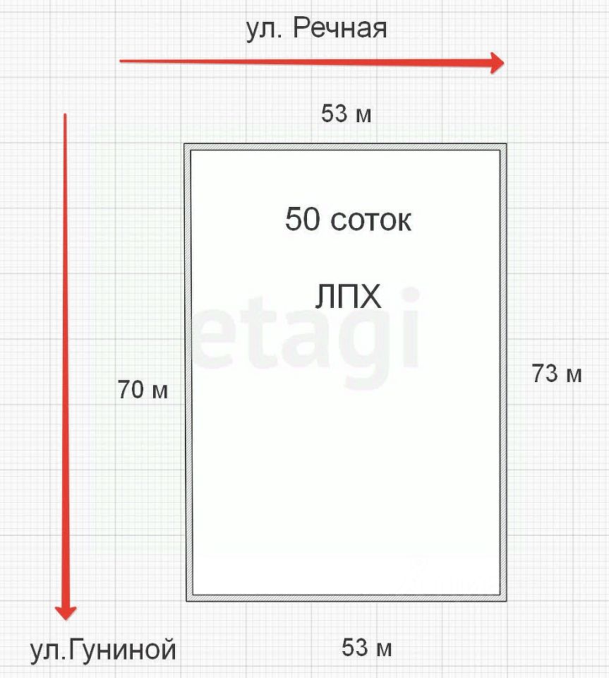 Площадь 50 соток, фасад 72 м (стороны 53/73/53 м).Земли поселений (земли населенных пунктов), Для ведения личного подсобного хозяйства.