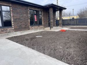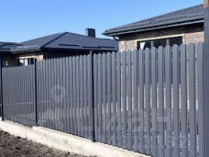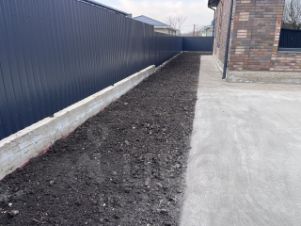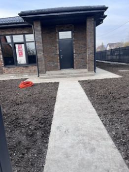 Вокруг дома отмостка и стоянка для автомобиля ,забор евроштакетник.