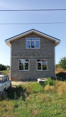 На первом этаже расположены холл, кухня-столовая и совмещенный санузел, тех помещение.коридор. на втором - две спальни. коммуникации: электричество 15 кВт,. скважина газ по меже,