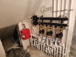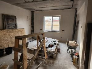 Сейчас внутри делаем отделочные работы, поштукатурены стены, сделали стяжку (кроме спален везде тёплый пол), электрику, установили радиаторы в комнатах, газовый котёл отопления.