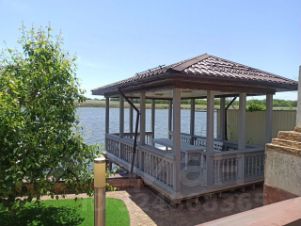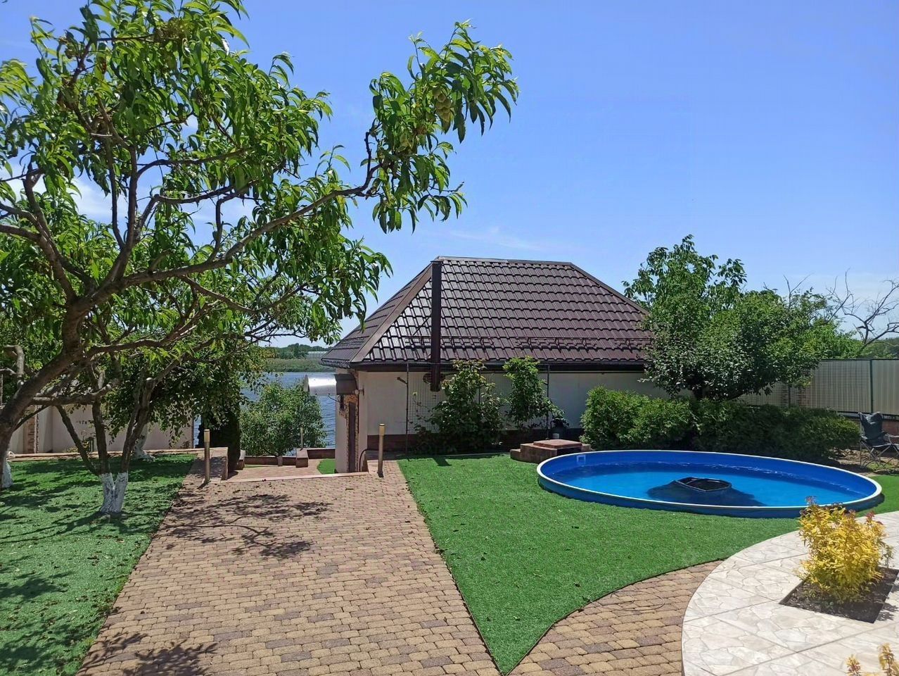Во дворе терраса обустроена перед стационарным басейном, а далее имеется помещение для гостей, с выходом к зоне барбекю и летнему навесу-беседкой над водой.