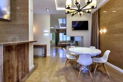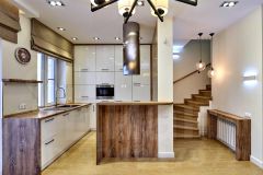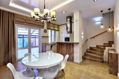 На первом этаже: прихожая, с/у с постирочной, кухня столовая, просторная гостиная 33м2, 2 сплит системы, на полу керамогранит под дерево с подогревом, биокамин.
