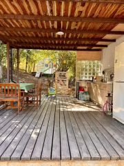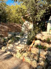 Участок отличается развитой инфраструктурой: здесь обустроены парковка на два автомобиля, бетонные лестницы, габионы и альпийская горка. Есть зона для отдыха и детская площадка.Важным преимуществом является верхняя площадка с подпорной стеной, собственным септиком, подведенными электричеством и водой, а также разрешением на строительство без отступов от границ. Коммуникации обеспечивают автономность и круглогодичное проживание: скважина глубиной 100 метров, большой септик, выделенная электрическая мощность 30 кВт и проводной интернет. В настоящее время решается вопрос о подключении к газовой магистрали, а действующая система водяного отопления и теплых полов, работающая от камина, легко может быть .