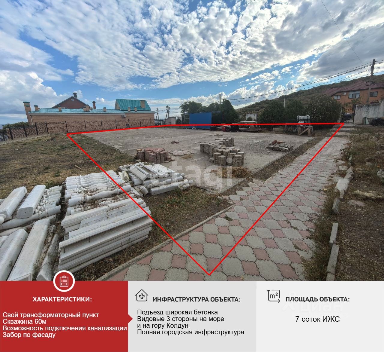 Главным преимуществом участка является панорамный вид на море. С участка открывается вид на море, на бухту и на гору колдун.