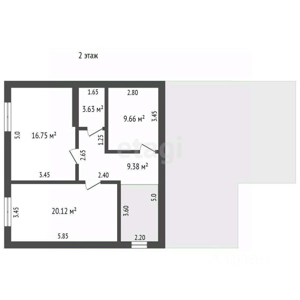 Второй этаж: большая комната с 2 окнами (20,12 м²), комната (16,75 м²), небольшая комната (9,66 м²), санузел (3,63 м²), чердачное помещение.
