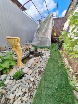 * Навес для автомобиля, ухоженный газон и сад с фруктовыми деревьями, кустарниками и цветами создают атмосферу уюта и гармонии.