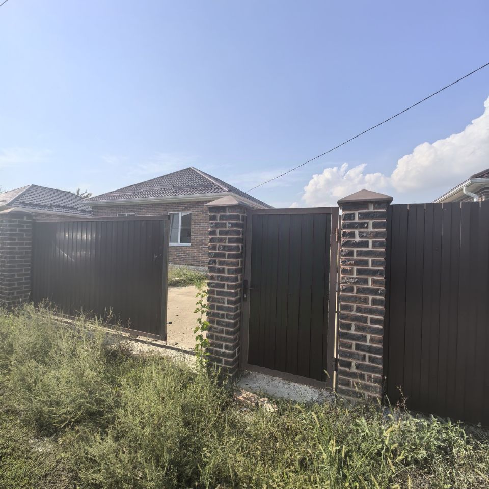 На территории устроена бетонная парковка на 2 парковочных места. По периметру дома установлен забор из профлиста, на въезде - откатные ворота.