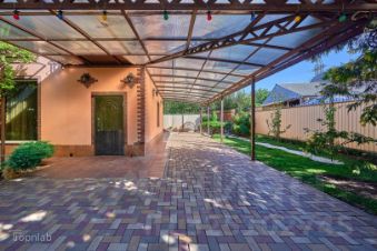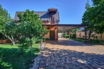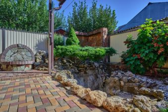 крытый навес для парковки машин, хоз.блок, искусственный водоём с альпийской горкой, фруктовые деревья, участок 8.5 соток позволяет поставить бассейн.