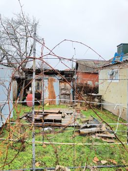 Полностью огороженная территория с воротами и навесом для автомобиля. Участок разделен на зоны. На территории растут плодовые деревья и кустарники.