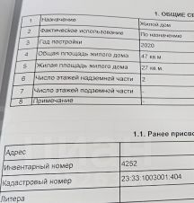 Пpeдлaгаю Вaшeму внимaнию Жилой дом с земeльным учаcтком в 60 км oт Туaпсе и Чёpнoгo мopя!!! MECТОПОЛOЖEHИЕ: Дом наxoдитcя в cт Aвангapд, ocтaновка элeктpички, ст Чaйкa, нeдaлеко от сeла Шaумян. От гopoдa Туaпсe и Чeрнoгo моря 60 км.. Пpoeзд на мaшине c Туапсе по аcфальтной дороге 40 км и через село Шаумян по грунтовой дороге 20 км, или на электричке.Садовое товарищество находится в лесу. Рядом лес, горы, реки. Природа необыкновенная! Есть кто проживает постоянно. ПАРАМЕТРЫ ОБЪЕКТА: Дом капитальной постройки 2020 года из бетонных блоков первый этаж и второй мансардный из кирпича.Свайно-ленточный фундамент.Габаритные размеры- 7 на 4 метров. Общая площадь дома - 47 кв.м .. Без внутренней отделки. С интересной планировкой. Дом светлый с высокими потолками. Установлены евроокна, двери. Есть балкон и навес по периметру дома. Остается много строительных материалов для внутренней отделки и утепления. На первом этаже расположена просторная гостиная -15 кв. м. , и кухня- прихожая- 8 кв. На втором этаже две комнаты -- 9 и 12 кв. м. Электричество в ст нет. У соседей солнечные батареи и генераторы. Для воды необходимо бурить скважину до 20 метров глубиной. Есть хозпостройка и бытовка, которую можно переоборудовать под баню.Приусадебный участок- 7 соток, без уклона. ДОКУМЕНТЫ: По документам зарегистрировано право на жилой дом и земельный участок. Прописка возможна. Технический паспорт есть, межевание в процессе, скоро будет готово! Участок- земли сельхозназначения, для садоводства. Один собственник. Документы готовы и в порядке. Любые виды расчетов- ипотека, сертификаты. Цена на данный момент 1250 т. р. ЗВОНИТЕ! Записывайтесь на просмотр! Отличная цена за жилой дом и приусадебный участок! Если не смогли дозвониться, пишите. Всегда на связи, просто с авито бывает сложно дозвониться.