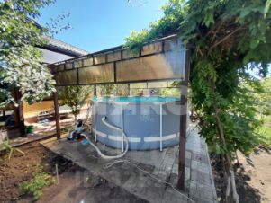 На участке расположена кирпичная хоз. постройка, площадка с каркасным бассейном, просторная теплица.