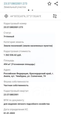 Назначение участка - для ведения личного подсобного хозяйства, кадастровый номер