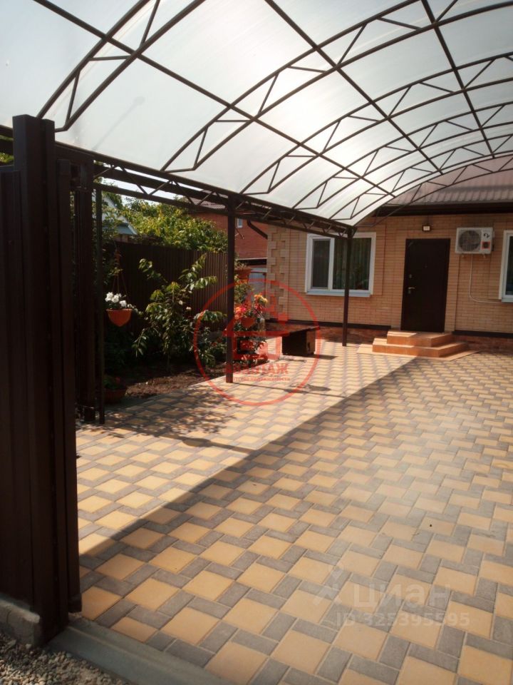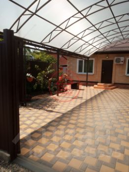 Аккуратный двор с плиткой перед домом и навесом место для отдыха и парковки.