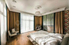 Дом 922 кв.м. в два этажа, имеет 4 спальни на 2м этаже с индивидуальными санузлами, гардеробными комнатами, балконами. На 1м этаже столовая с современной мебелью и оборудованием, гостиная, сауна с большим бассейном, душевыми и санузлом, просторный спортивный зал, гостевой санузел, кабинет. Несколько входных групп. Выполнен качественный ремонт из дорогостоящих материалов, мебель Итальянских производителей по индивидуальному заказу. Дом для обслуживающего персонала 250 кв.м.