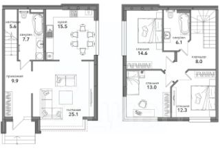 - площадь 2 этажа 55,5 кв.м.: три спальни 14,6кв.м., 13кв.м., 12,3кв.м., сан/узел 6кв.м.