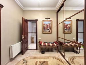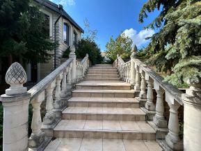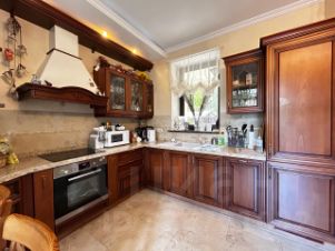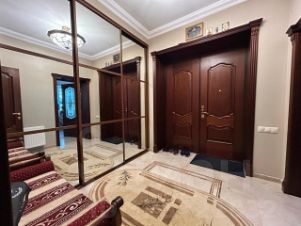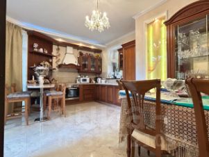 На первом этаже расположены с центрального входа прихожая (8м2) с гостевым сан узлом (5,2м2).Роскошная , с большими окнами, светлая гостиная(39м2) переходит в обеденную зону-кухню(24м2) в которой есть вся встроенная техника, включая посудомоечную машину с холодильником. На кухне установлена сплит система которая работает как на охлаждение так и на обогрев. Из кухни выход на красивую террасу с видом во двор на зеленые хвойные деревья. С кухни вход в личный кабинет (17м2) который имеет отдельный рабочий выход на улицу во двор. Так же на первом этаже расположена просторная спальня (20м2)с личной ванной комнатой(7,5м2) и гардеробом (4,6м2). В гостиной и кухне на полу итальянский керамогранит, с потолка свисают две шикарные хрустальные люстры. На стене в гостиной расписана художником фреска Георгия Победоносца. С первого на второй этаж ведет капитальная красивая, кованная лестница, ступени обрамлённые гранитом .