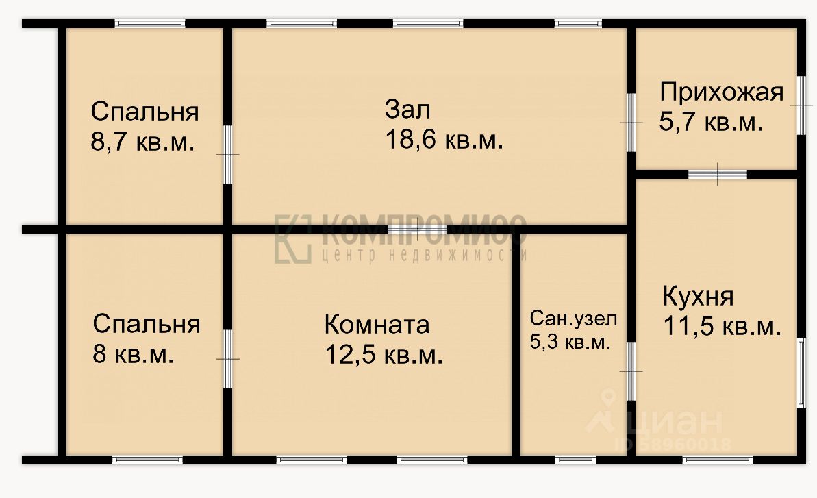В доме 4 комнаты: 2 проходных зала и 2 изолированные спальни, сан.узел, кухня и прихожая. (см. план)