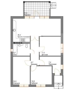 Дом в предчистовой отделке с удобной планировкой. Просторная кухня-гостинная 26,2 м2 с выходом на террасу 11,3 м2, три изолированных комнаты 14,8 м2, 10,4 м2, 9,7 м2, санузел 5,4м2, прихожая 3,9м2. Чердачное помещение со складной лестницей, возможно переоборудование под полноценный мансардный этаж.