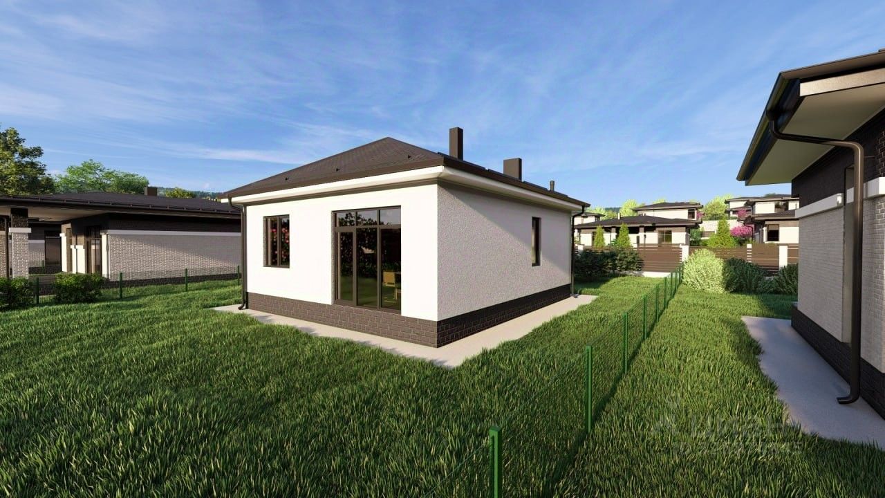 1-этажный дом с двумя спальнями, просторной кухней-гостиной с теплым полом, котельной, крыльцом, построенный на территории современного премиального коттеджного поселка (благоустройство, инфраструктура, дороги, детские и спорт площадки).