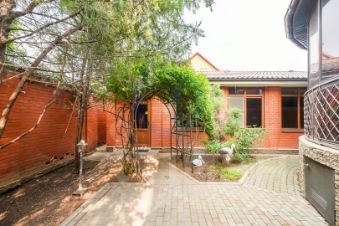 Участок угловой, полностью кирпичный забор, по периметру высажены березы, двор утопает в зелени.