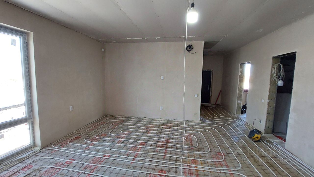 Отделка. Уложен тёплый пол, на полу плитка. Стены выровнены, оштукатурены, есть розетки, выключатели, кабель-каналы, проводка, трубы, натянуты потолки, установлен двухконтурный котёл.