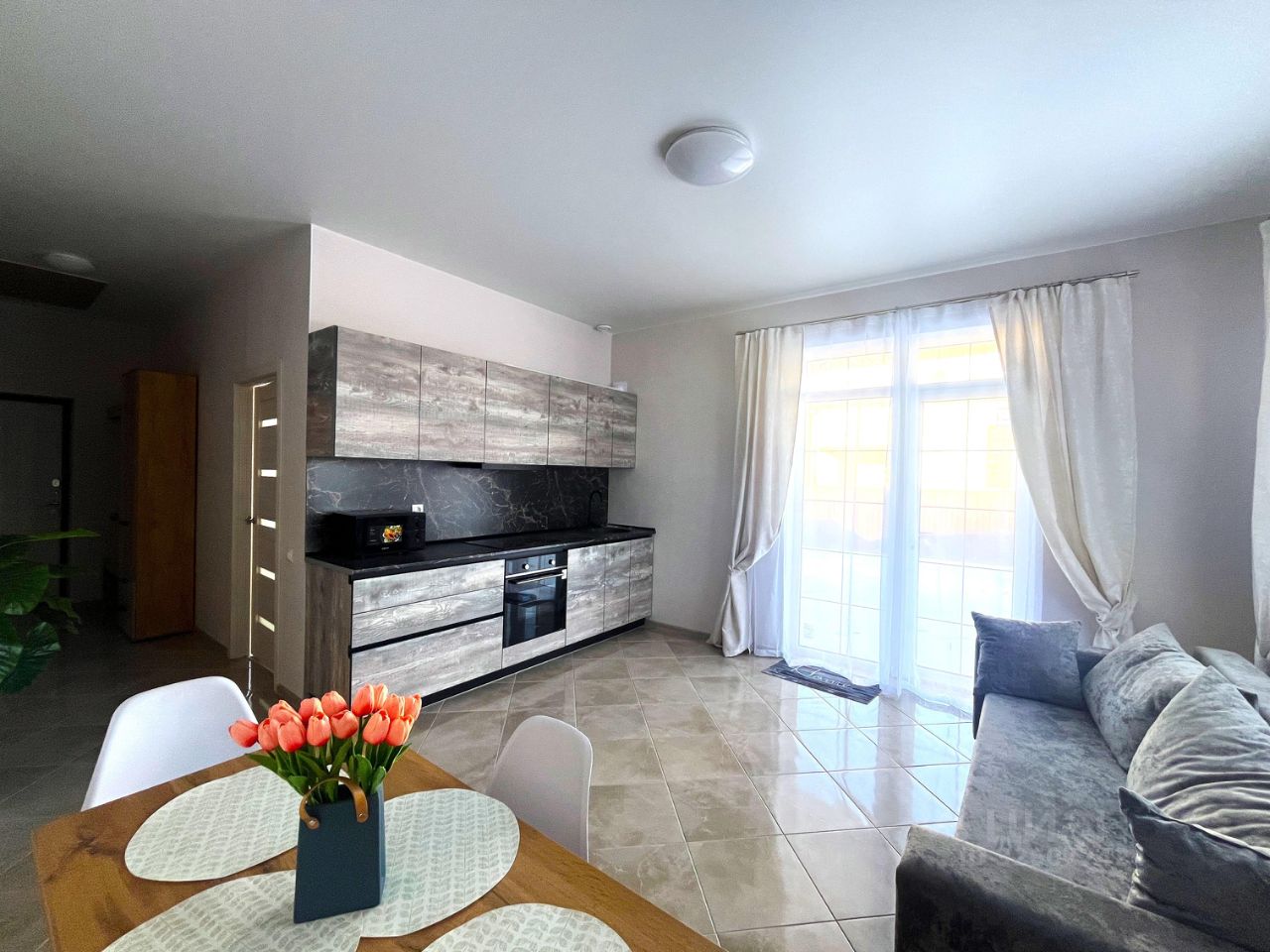 Дом мебелирован корпусной и мягкой мебелью: так, в кухне-гостиной установлен кухонный гарнитур со встроенной бытовой техникой, обеденный стол, мягкая зона и зона TV.