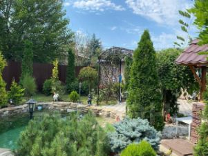 - Ландшафтный дизайн с большим количеством хвойных насаждений и декоративных растений.