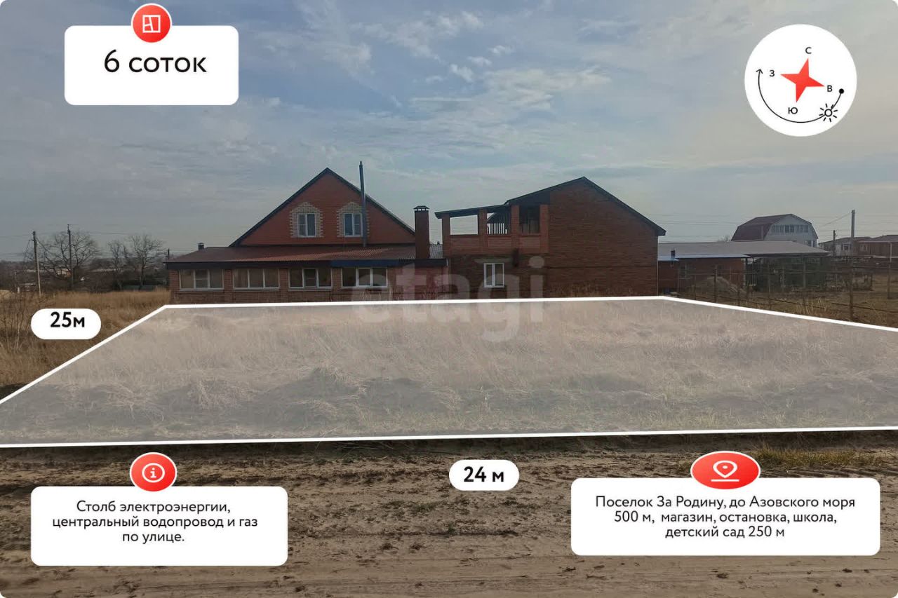 Отличное предложение, продается участок на первой линии от Азовского моря. Категория земли - Земли населенных пунктов, вид разрешенного использования - Личное подсобное хозяйство. Участок ровный прямоугольной формы, 25 метров фасад и 24 метра в глубину. Улица новая обильно застраивается, если построить дом в два этажа, с окон второго этажа будет прекрасный вид на море.