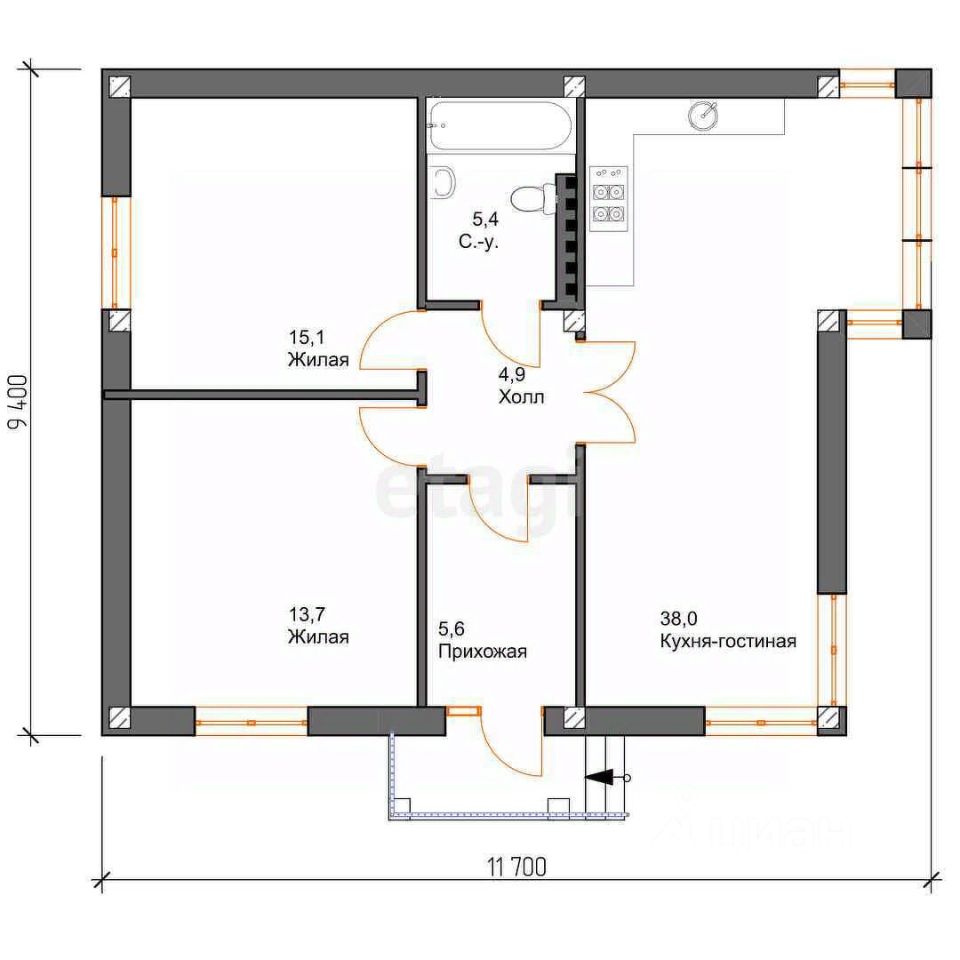На стенах штукатурка, сухая стяжка пола, разводка электрики, систем отопления, водоснабжения и водоотведения, выводы под электрокотел и розетки.