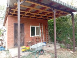 Двор плитка, также имеется навес для автомобиля.