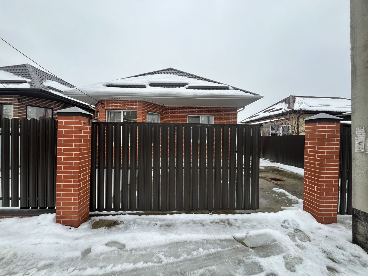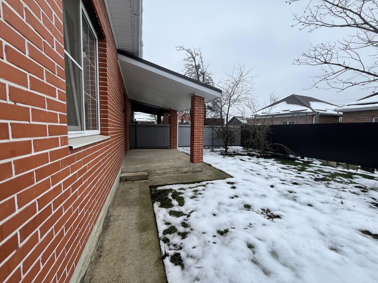 Участок по периметру огорожен забором ,по фасаду кирпичные колонны ,забор из Евроштакетника ,откатные ворота ,калитка.Двор забетонирован,отмостка,большой навес для автомобилей.