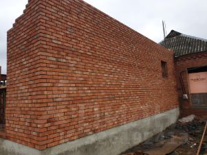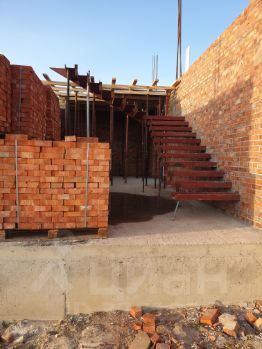 Залит надежный фундамент, выведены стены первого и второго этажа, залито железобетонное перекрытие второго этажа, готово основание для лестницы из швеллера, материал стен кирпич, толщина 420 мм, 1.5 кирпича, с воздушной прослойкой.