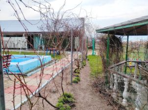 Дом из блока с ракушкой, оштукатурен и покрашен, фасад обшит сайдингом, очень теплый, 1967 года постройки. Состоит из четырех комнат, двух проходных и двух изолированных. Общая площадь 80 кв.м., жилая 41,3 кв.м., кухня-столовая - 30 кв.м. Коммуникации центральные: газ, свет и вода, канализация - септик. Дополнительно имеется колодец для полива и набора бассейна.