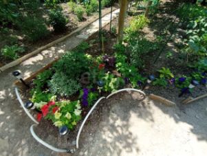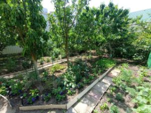 На участке есть навес под автомобиль, беседка, хозпостройки, высажены плодоносящие деревья и красивые цветы.