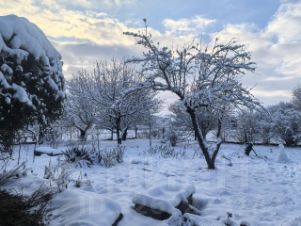 Фруктовый сад (яблони, груши, черешня, слива, орех и др.) и огород.