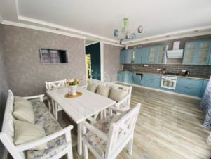 На первом этаже расположена объединенная кухня-гостиная с панорамным остеклением и выходом на террасу, оборудованная стильным кухонным гарнитуром с техникой, а также гостевая комната с мебелью и полностью укомплектованный санузел. На второй этаж ведет монолитная лестница, где находятся три просторные светлые спальни в современном стиле и второй санузел. Дом подключен к сетевому газу, имеет автономное водоснабжение из скважины и септик.