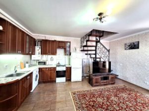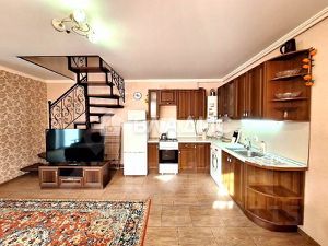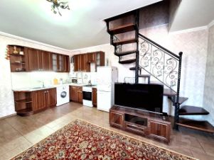 Площадь каждого таунхауса 72 кв.м. На первом этаже расположена просторная кухня-гостиная 27 кв.м., совмещенный санузел. На второй этаж ведет удобная лестница. Там расположены две изолированные спальни, по 14 кв.м каждая и гардеробная. В каждой комнате установлены сплит-системы.