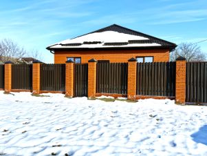 Участок огорожен по периметру забором, фасадный — с кирпичными колоннами, евроштакетник, откатные ворота, калитка.