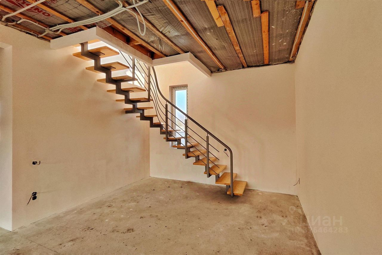 На первом этаже расположены спальня, ванная комната, коридор, кухня-гостиная, котельная с отдельным входом. На втором этаже две спальни, санузел. Панорамные окна.