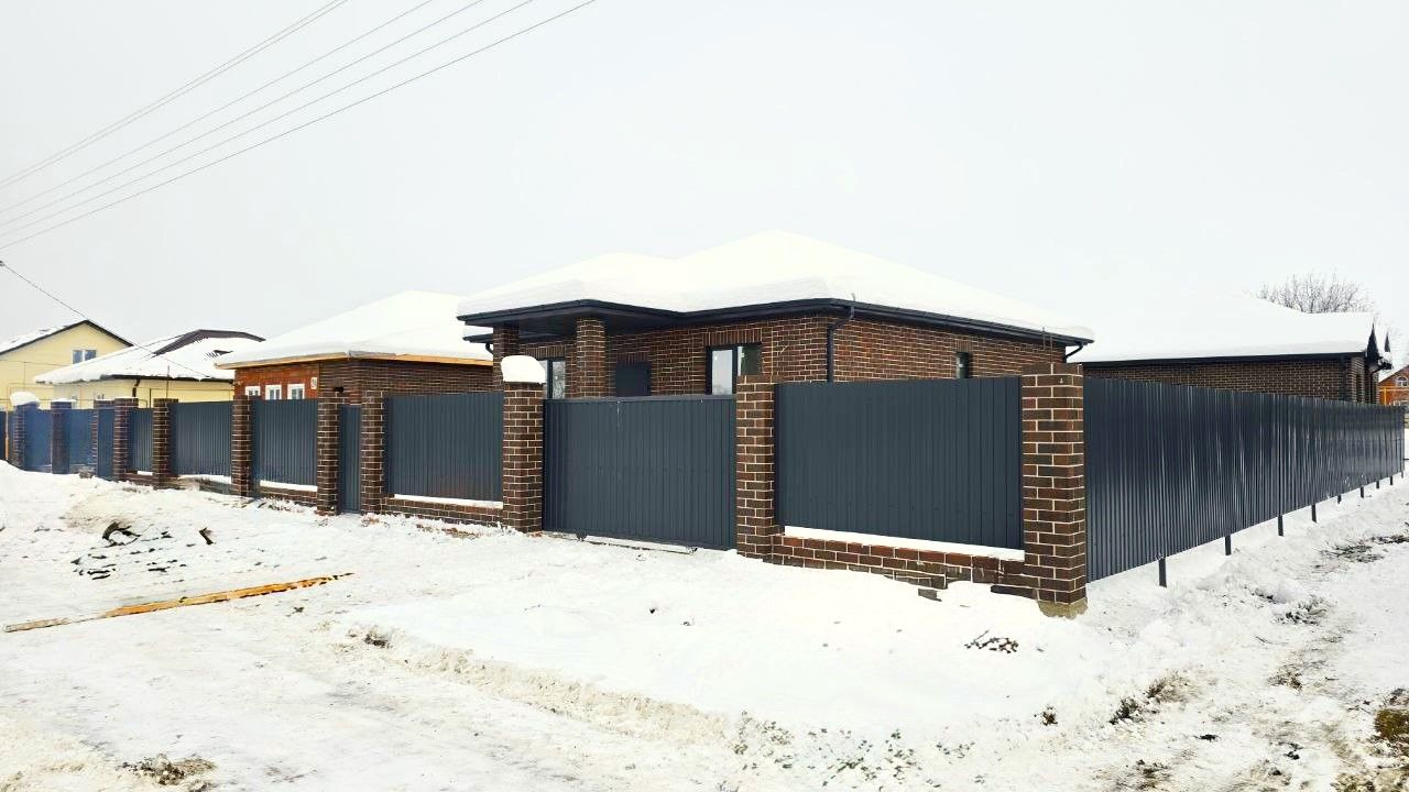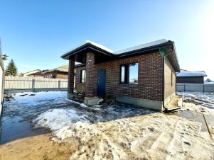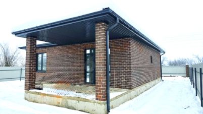 Одноэтажный коттедж возведен полностью из кирпича на свайно-ростверковом фундаменте, высокий цоколь, внутренние стены — забутовочный кирпич, наружные стены — облицовочный керамический кирпич, мультифункциональные металлопластиковые окна с внешней ламинацией, кровля — металлочерепица, капитальная крытая терраса.
