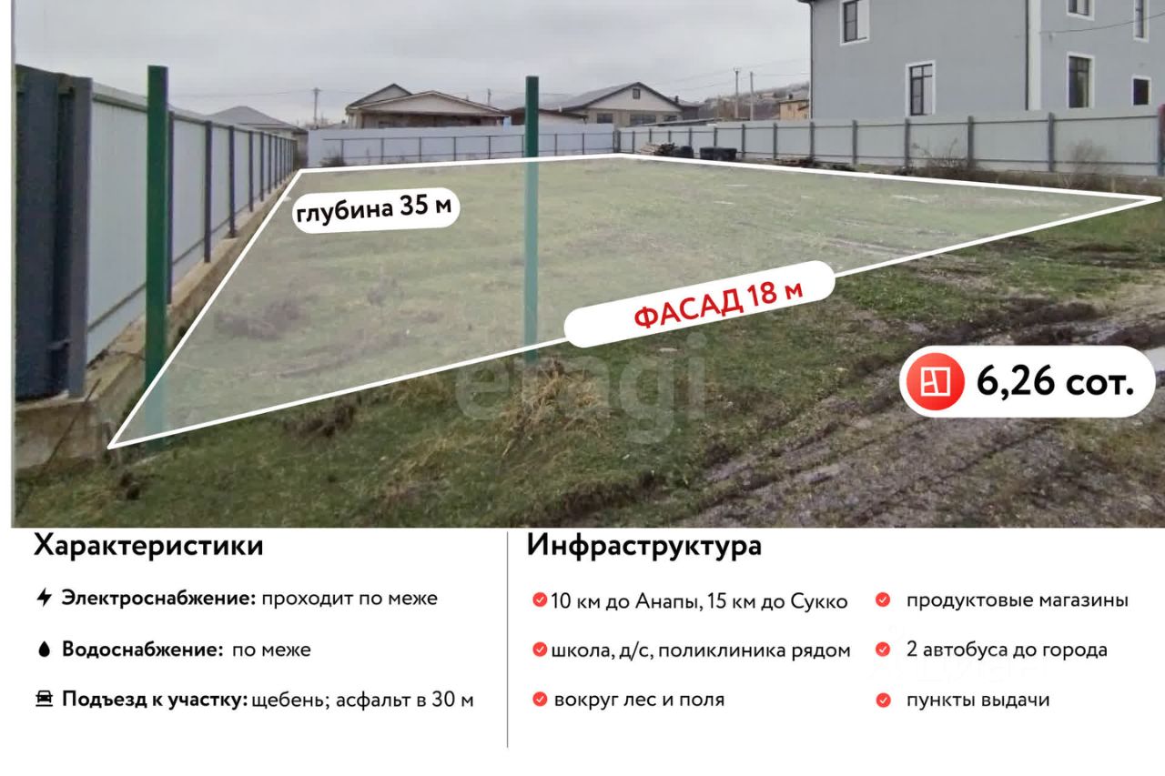 Инфраструктура представлена магазинами в шаговой доступности, остановка общественного транспорта в 100 метрах обеспечивает быстрое сообщение с Анапой, дорога до которой занимает 10-15 минут.