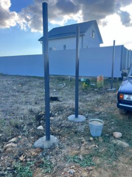 Забор установлен частично: справа полностью, слева — на половину, столбы залиты железобетонные