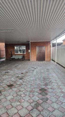 Двор выложен тротуарной плиткой ,большой навес для автомобилей.