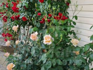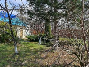 Красивый сад, где растут 3 черешни, 3 яблони, 2 инжира, кизил, груша, слива, вишня, 10 лоз винограда сортового, много роз и хвойных деревьев.