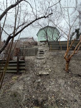 Участок: Отмостка вокруг дома железобетонная с крыльцом входа в дом. Ровная площадка перед домом для обустройства зоны отдыха. Террасный сад с плодородной землей, уже высажены плодовые деревья, виноград и ягоды. Проложены дорожки из речного камня. Есть садовый кран для полива, накопительная бочка 5 куб.м.