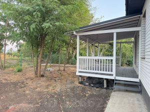 Территория полностью благоустроена: выполнена отмостка по периметру, сделано полное освещение и высажены хвойные деревья и молодые плодовые саженцы (яблоня, слива).