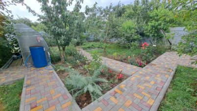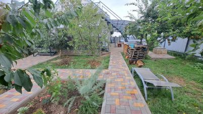 - Идеальный ландшафт: Полностью благоустроенный двор, где каждый элемент на своем месте. Аккуратные мощеные дорожки из разноцветной тротуарной плитки ведут к зонам отдыха и плодоносящему саду. Здесь растут: слива, виноград, крыжовник, персики, яблоня, груши и абрикосы, а также ухоженные клумбы с ароматной лавандой и розами.