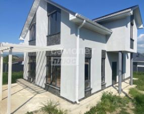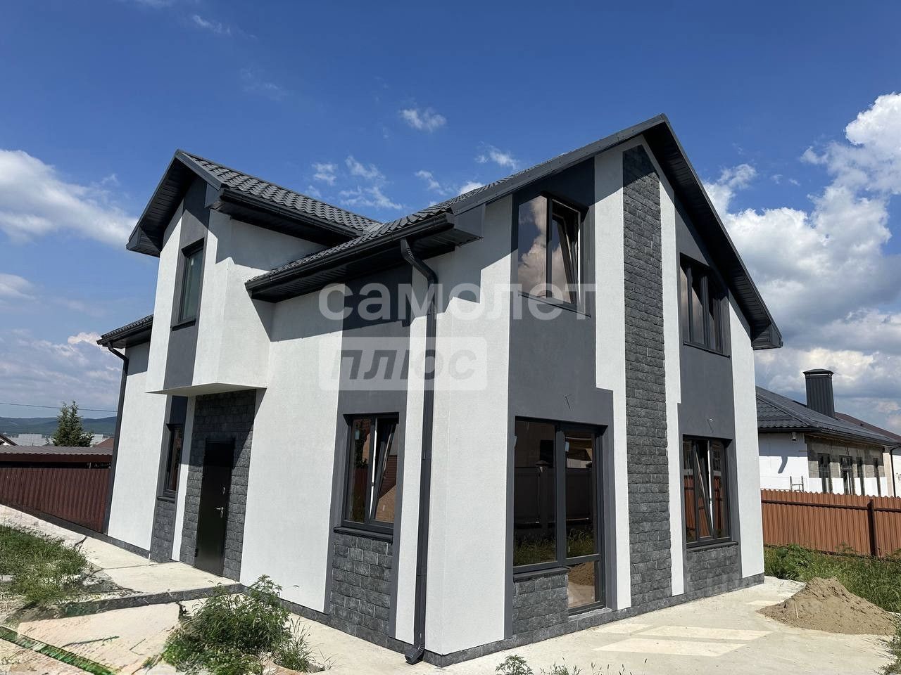 Общая площадь дома составляет 160 квадратных метров, а участок занимает более 3 соток. Участок имеет правильную форму и ровный рельеф. По периметру участка установлен забор, откатные ворота и калитка.