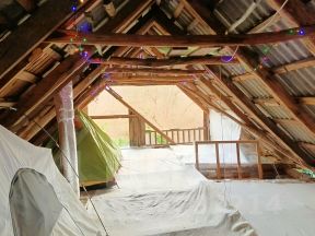 Опорные балки (обвяз) отреставрированы. Балки черного пола заменены, антисептированы. На "черный" пол постелен войлок. Стены изнутри заштукатурены стартовым слоем гипса (2025). Косметики нет.
